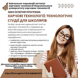 Запрошуємо Вас до нас на захопливе навчання за міні-освітньою програмою «Харчові технології: технологічні студії для школярів», яке проходитиме в стінах Національного університету харчових технологій (м. Київ) з 29 по 31 жовтня 2024 року.