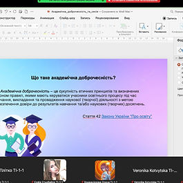 Кураторка групи ТІ-1-1 Навчально-наукового інституту харчових технологій НУХТ, доцент Оксана Олександрівна Басс, провела онлайн-зустріч, прис вячену темі академічної доброчесності. Під час обговорення були використані матеріали презентації, що допомогли студентам краще зрозуміти важливість чесності та відповідальності у навчанні.